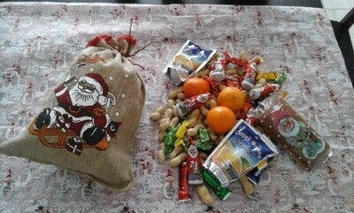 Füllung des Claussack: Nüssli, Clementinen, Sugus, Lebkuchen, Caprisonne, Chlausschokolade, Branchli